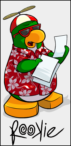 Rookie jest zielonym pingwinem, ubranym w czerwoną koszulę (Red Hawaiian Shirt) lub strój pudła (Box Costume). Ma założone również czerwone okulary przeciwsłoneczne (red sunglasses) oraz czapeczkę ze śmigiełkiem (red propeller cap). Jest agentem PSA i EPF. Po raz pierwszy ukazał się w misji „Case of the Missing Coins”. Od 26 Marca 2011 roku (April Fools 2011) jest jedną z gwiazd na wyspie - można go spotkać, porozmawiać i zdobyć znaczek. Rookie popełnia błędy, których tajni agenci nie powinni. Może być ubrany jednocześnie w Czerwoną Hawajską Koszulę i w Kostium Pudła.