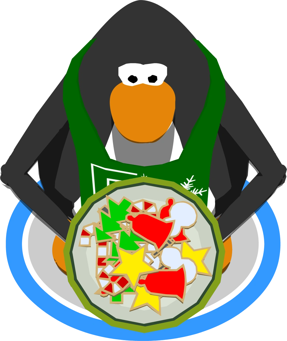 A penguin wearing the Cookie Serving Apron, holding a plate of cookies