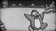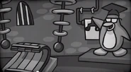 The scene lights up. One can see a penguin in a graduation hat. Pulling a switch, the scientist zaps a toboggan with their machine. Rising from the table, they let out an evil laugh. "BWA HA HA! IT'S ALIVE!" The camera cuts to outside, where the sled is hopping around, terrorizing two penguins. One runs off screaming "AAAAAAHHH!", while the other uses the Surprised emote. The movie ends.