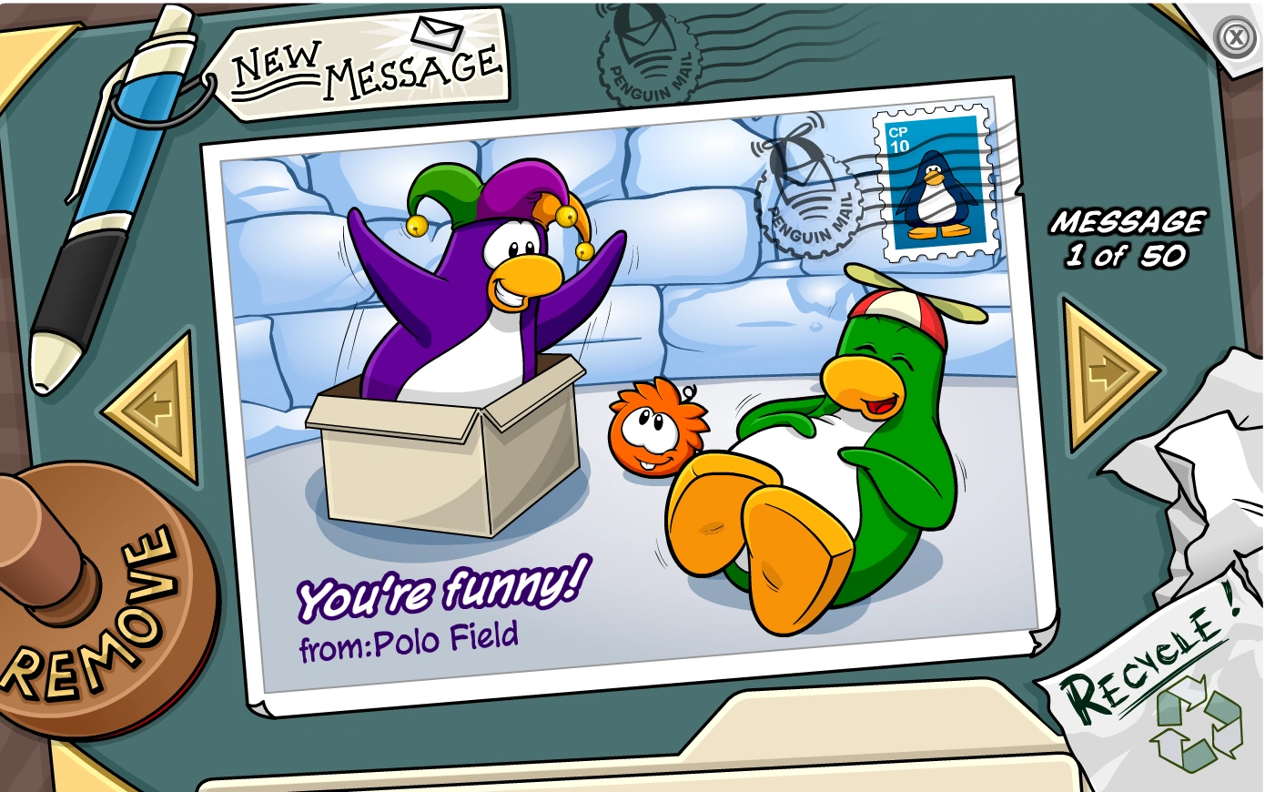 - On July 14, 2008, the Penguin Mail feature was released following the Club Penguin Improvement Project. With this update, postcards could be received even if the player was offline, and received postcards were kept in the player's mailbox,[2] accessible through an envelope icon, in place of the previous smiling face icon. Rather than being deleted when the player closed the postcard, postcards now had to be manually deleted, either one at a time with a "trash" button, or all from postcards received from a specific player at once with the "remove" button. A reply button was introduced to quickly send a postcard back to someone who sent one, providing the other player was on the sending player's buddy list. Most of the existing old postcards were either removed or redesigned with updated artwork.