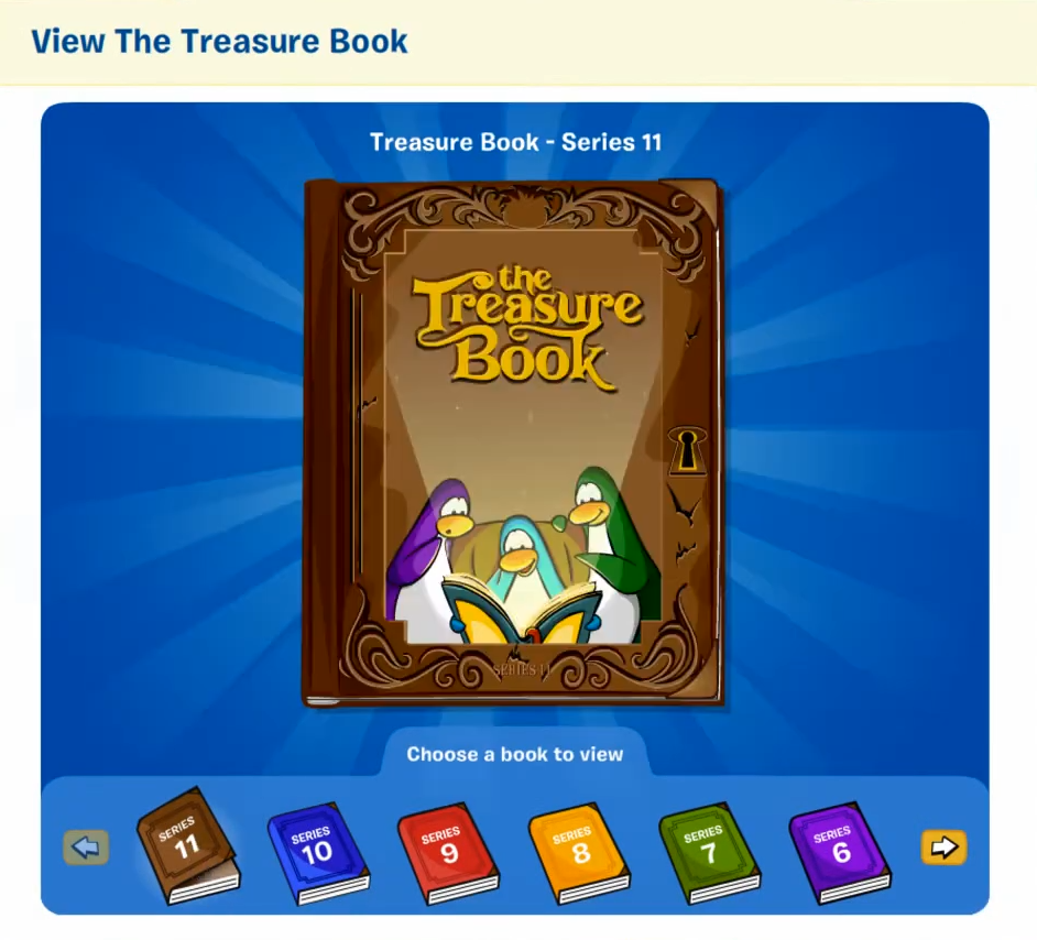 The Treasure Book was normally only accessible when using a code, although it could be previewed, in which case no items could be selected to be unlocked. Series 1โ13 could be previewed on the Toys page on the Club Penguin website prior to October 4, 2011. When series 14 released and the old series were removed, the Treasure Book could instead be previewed in the Clothes Shop, but only the newest series, as each new series replaced the previous one. When previewed from the Clothes Shop, the tags on items (which show names when hovered over) were removed, and buttons to access the toys or unlock pages on the website were present.