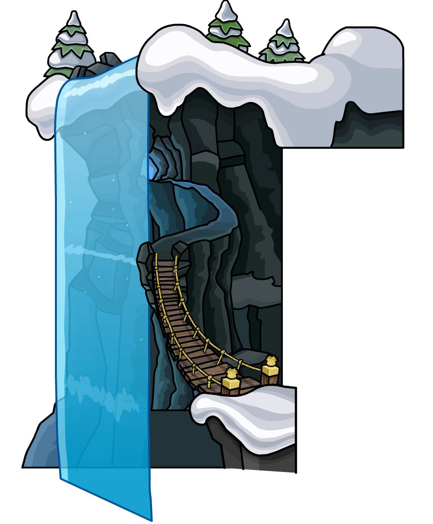 Although the starting point of the river that flows into the waterfall is unknown, the waterfall itself is located near the Dojo. The bottom of the waterfall merges with the River at the Lava Cliffs. Following this river upstream leads to the frozen-over Outback Pond, while following it downstream leads behind the Dojo and past the Ice Falls, before eventually winding around behind the Ski Hill.